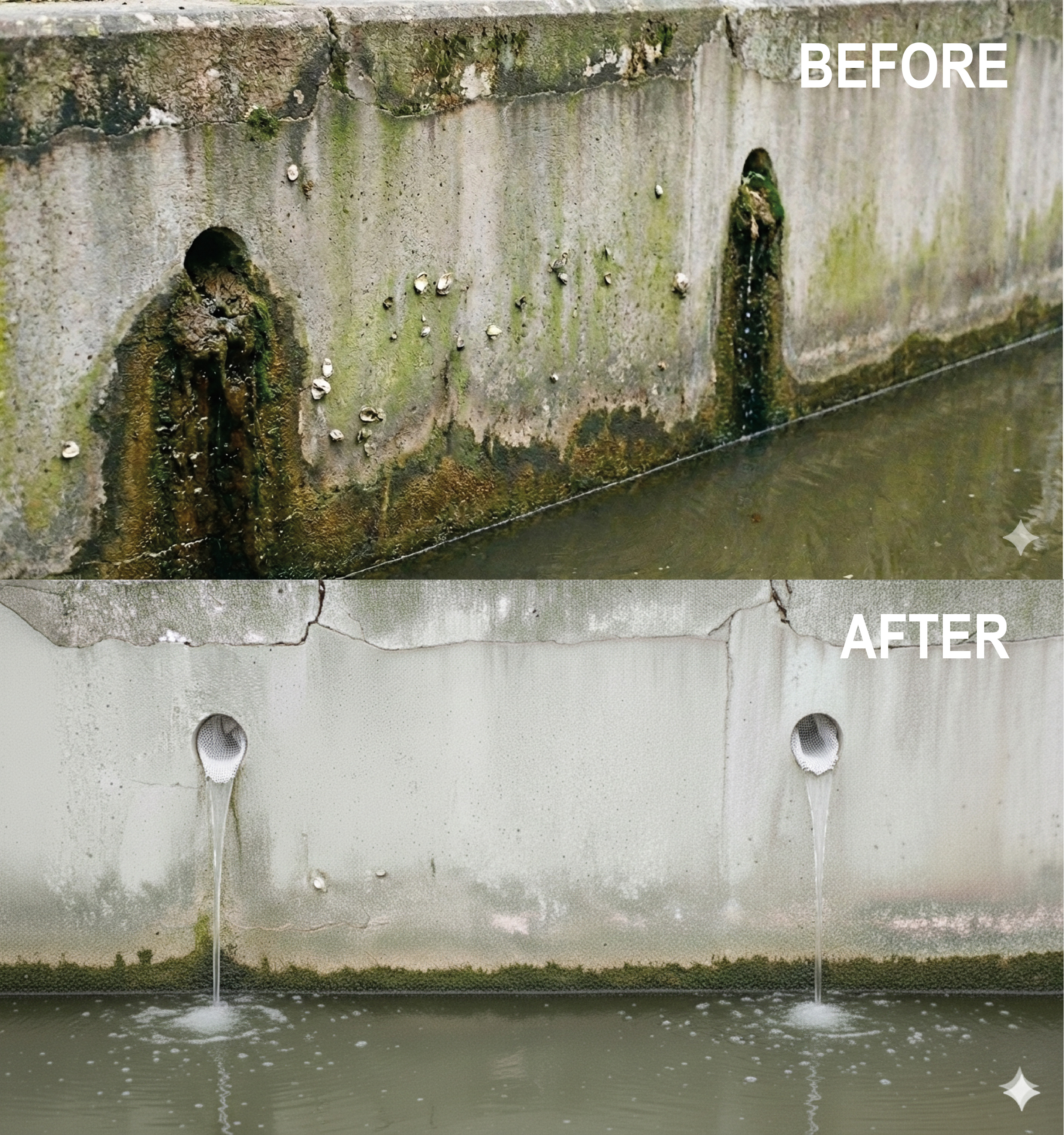 In short, by preserving a passage for water flow between the water and landsides of the wall (such that there is no hydrostatic pressure on the wall as the tide rises and falls) and by keeping wall joints in working order. This means replacing plugs, seals, and joints, and ensuring all passages are clean of debris and marine life. Aesthetically we also clean walls (to well-below the high tide mark) to enhance visual appearance
